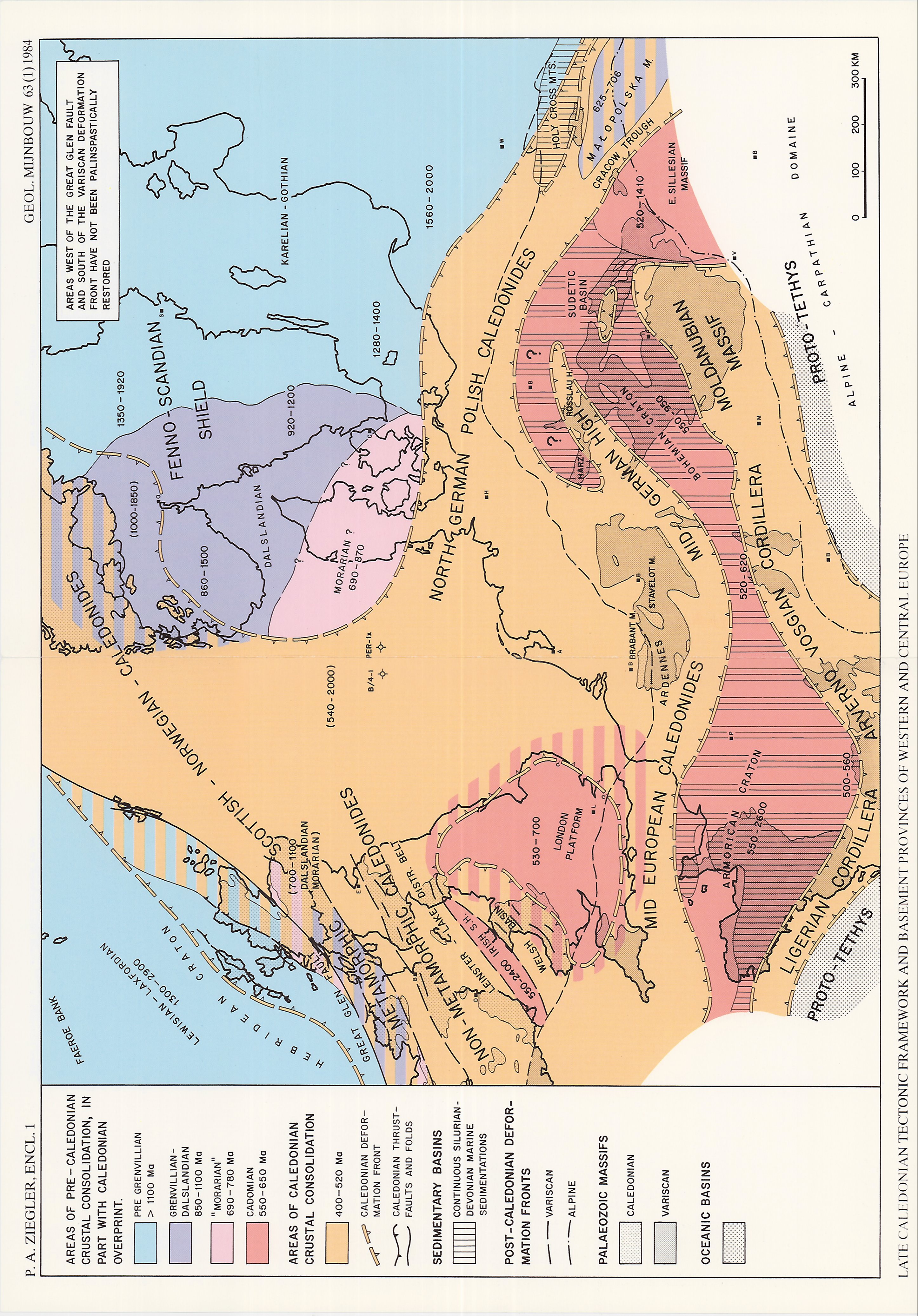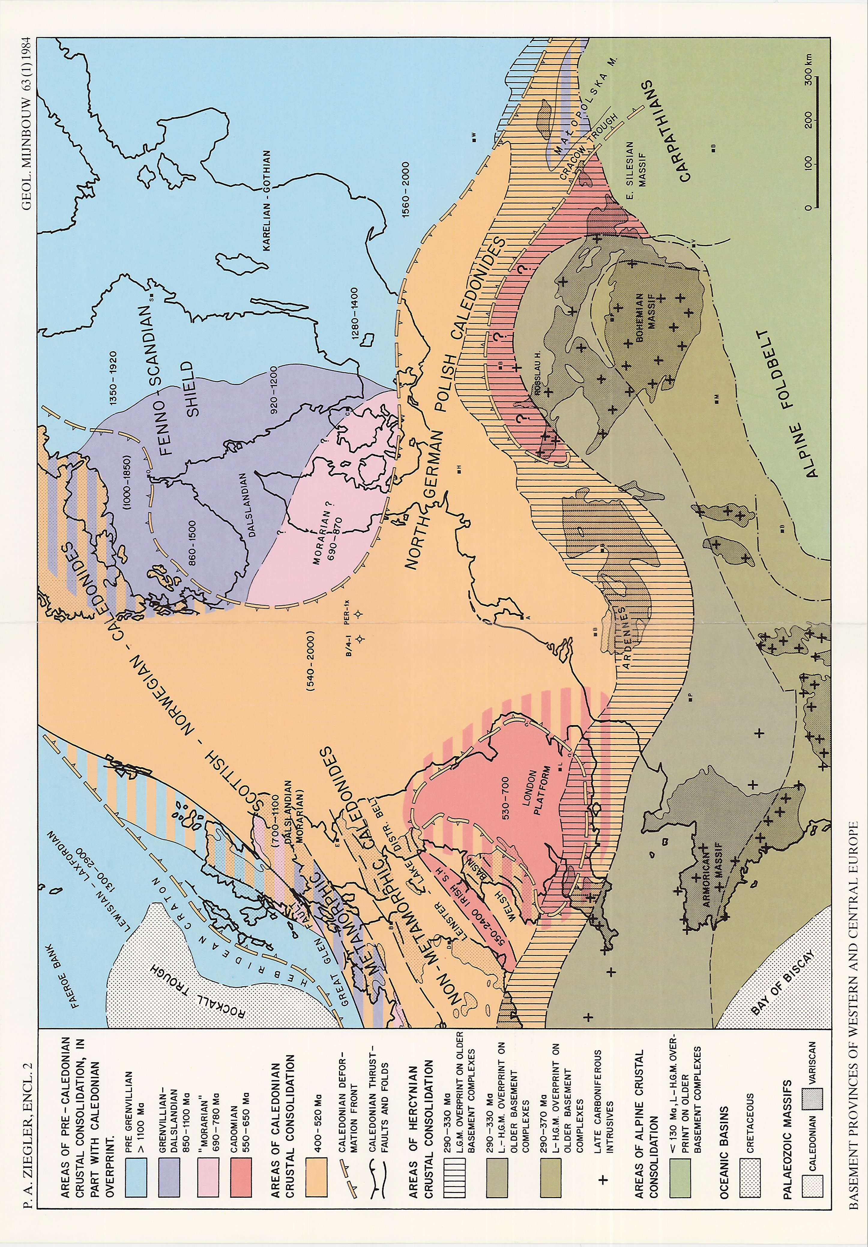 The crystalline basement of Western and Central Europe consists of a mosaic of crustal elements which were consolidated during pre-Grenvillian, the Grenvillian-Dalslandian, Morarian, Cadomian, Caledonian and Hercynian orogenic cycles. Contemporaneous with the Caledonian suturing of the Precambrian Laurentian-Greenland and Fennosarmatian shields a number of Gondwana-derived Cadomian micro-cratons were accreted to the southern margin of Laurasia. Following the Late Caledonian paroxysm, the Devonian and Early Carboniferous evolution of Europe was dominated by continued subduction of the Proto-Tethys plate at an arc-trench system parallelling the southern margin of Laurasia, the accretion of additional Gondwana-derived continental fragments, back-arc rifting, and a sinistral translation of major proportions between the Laurentian-Greenland and the Fennosarmatian sub-plates. The Acadian and Bretonian orogenies were of the Pacific type. The Visean collison of Gondwana with Laurasia marked the onset of the Himalayan-type Variscan orogeny during which collision related compressive stresses overpowered the Devonian-Early Carboniferous back-arc rift systems and caused the development of A-subduction zones. The Central Armorican-Saxothuringian successor basin became folded and destroyed during the latest Visean, whilst the Variscan foredeep became scooped out, in part by basement nappes, during the latest Westphalian. Major crustal shortening during the Variscan diastrophism was accompanied by the anatectic remobilisation of subducted lithosphere and a widespread syn- and late orogenic magmatism. The latest Carboniferous-Early Permian reorientation of the convergence direction between Gondwana and Laurasia induced the development of a complex wrench-fault system transsecting the Variscan fold belt, and extensive post-orogenic volcanism. The hypotheses summarised here require confirmation by further palaeomagnetic and radiometric data.