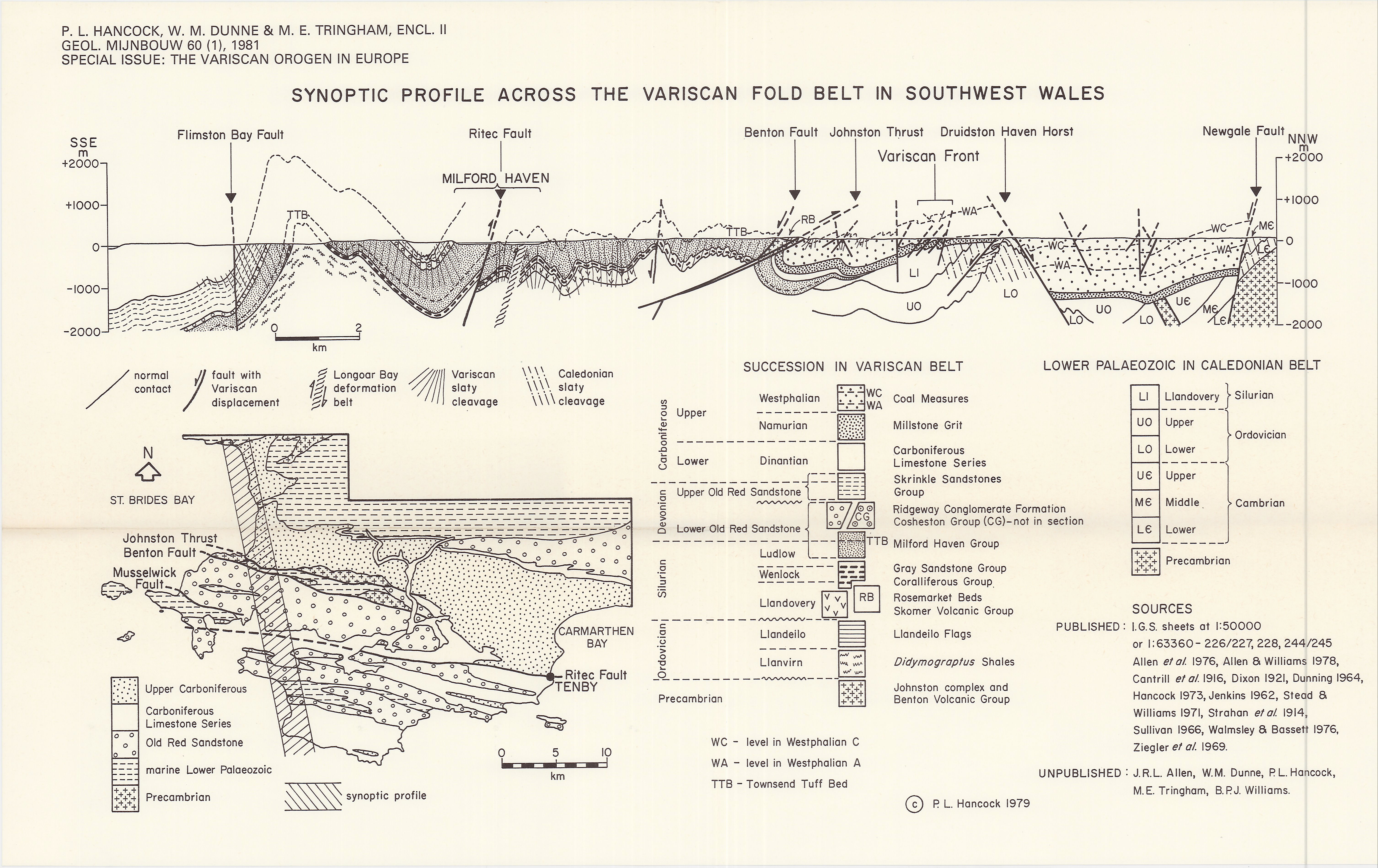 Palaeozoic rocks in the Variscan domain of SW Dyfed, Wales, were deformed under anchimetamorphic conditions during the late Carboniferous. Within the Pembrokeshire Coalfield a 1 km wide zone of conjugate folds and thrusts, external to the northern limit of slaty cleavage, is used to define the Variscan orogenic front. South of the front there is a progressive increase in the average amplitude of macrofolds across three further structural zones. Folding about a WNW axial trend was single phase except within a few narrow belts of refolded folds. Wrench and normal faults which developed during and after folding resulted in the axial elongation and clockwise rotation of the region. Structures in the paratectonic Caledonides controlled the locations of four WSW trending Disturbance Belts of Variscan age to the north of the front. In the Druidston Haven Horst, the westernmost of these Disturbances, Caledonian folds and cleavage were refolded approximately coaxially during the Variscan. The Variscan fold belt is cut by several, laterally impersistent, major strike faults which cannot be regarded as separating allochthonous blocks. Although displacements were dominantly reverse or normal the evolution of the faults during folding probably involved some scissor motion. On the Johnston Thrust northward overthrusting was followed by dextral strikeslip.