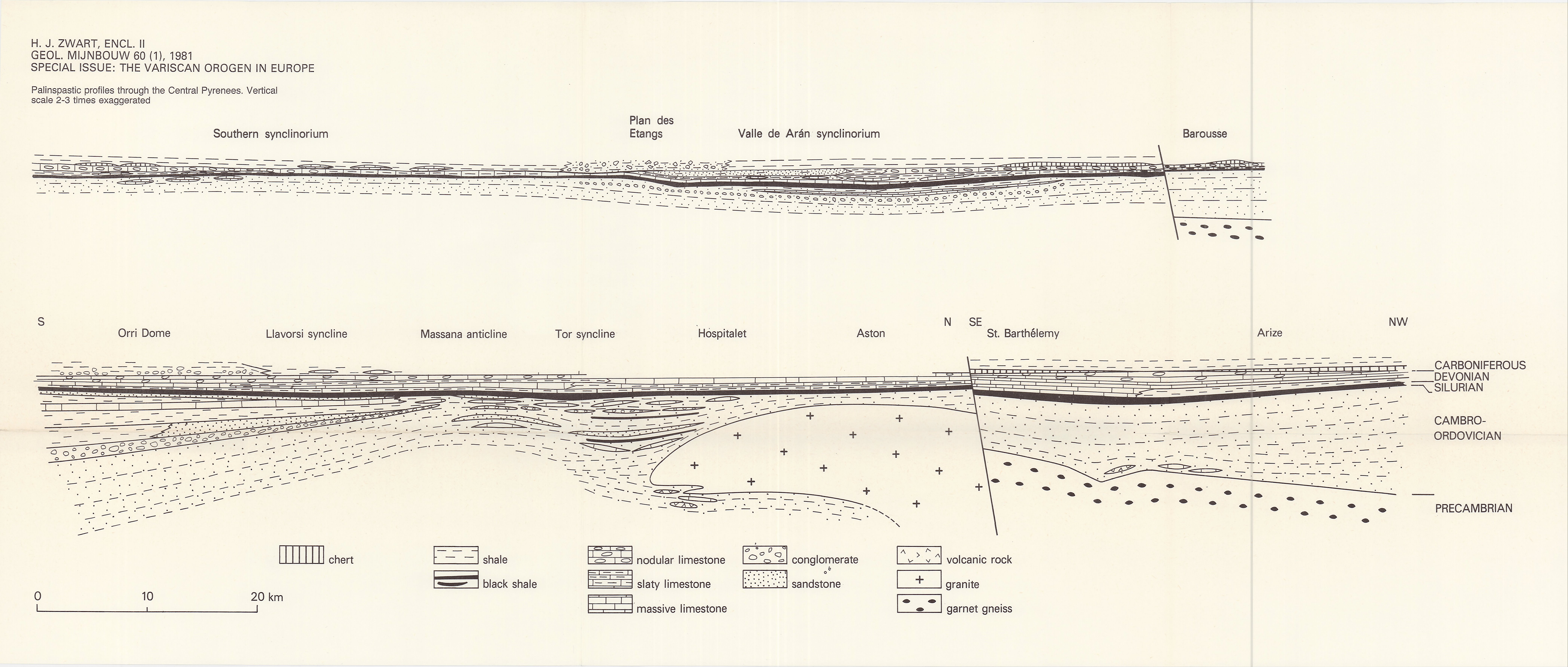 The Palaeozoic stratigraphic sequence of the Pyrenees, folded in Late Carboniferous time during the Variscan orogeny, consists of Cambro-Ordovician phyllites and quartzophyllites, Silurian carbonaceous shales, Devonian limestones, calcslates and slates with local sandstones, and Early Carboniferous shales. Igneous rocks consist of a pre-Variscan granite and late- to posttectonic granodiorites. Several generations of folds were formed during the Variscan orogenic period, of which the first two are responsible for most of the major structures. A large part of the folds shown on the profiles date from the second fold generation, usually called the main phase. These structures are accompanied by an axial-plane cleavage in low-grade rocks. In these rocks in the axial zone the cleavage forms half of a fan, which was formed by a late phase of tilting. In the high-grade infrastructure axial planes of folds and foliations are usually gently dipping. These structures were formed later and at the expense of earlier steep structures. Yet later fold generations have in general only resulted in small-scale structures.